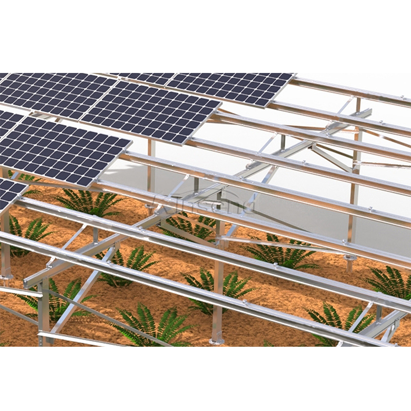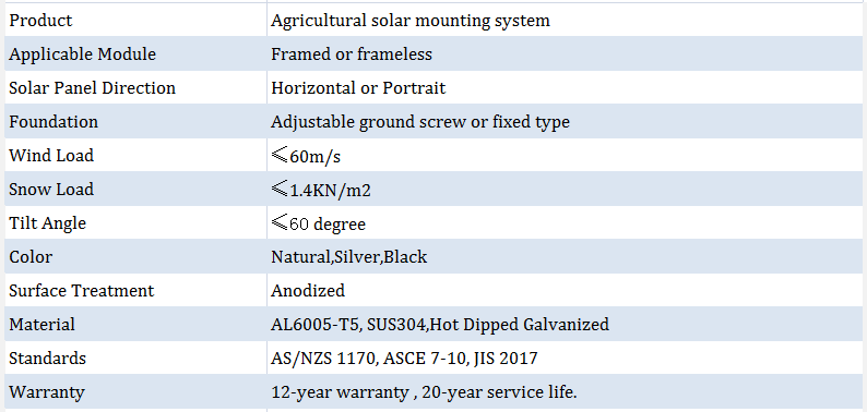 Los sistemas especiales de montaje solar agrícola para invernaderos permiten que los cultivos crezcan a una temperatura adecuada, lo que aumenta los rendimientos y permite que se utilice la luz solar. Los agricultores pueden aprovechar al máximo la energía del sol para las actividades básicas diarias como el riego, la calefacción y la iluminación.  Una solución con suficiente espacio, beneficios para el trabajo de la máquina Excelente rendimiento anticorrosivo componentes premontados, Tasa de sombreado personalizada     Sitio de instalación Área de campo abierto, por encima de las tierras de cultivo de siembra    Base de instalación Tornillo de tierra, distancia al suelo Más de 1800 mm Ángulo de inclinación Ángulo de inclinación personalizado Orientación del módulo Retrato de paisaje    Velocidad máxima del viento < 60 m/s    Carga de nieve < 80cm    Estándares AS/NZS 1170 y JIS C 8955-2011    Material      Material: Aluminio anodizado 6005 T6 acero inoxidable 304, 410; Acero galvanizado en caliente Q235B    Garantía / Duración  12 años/ Más de 25 años