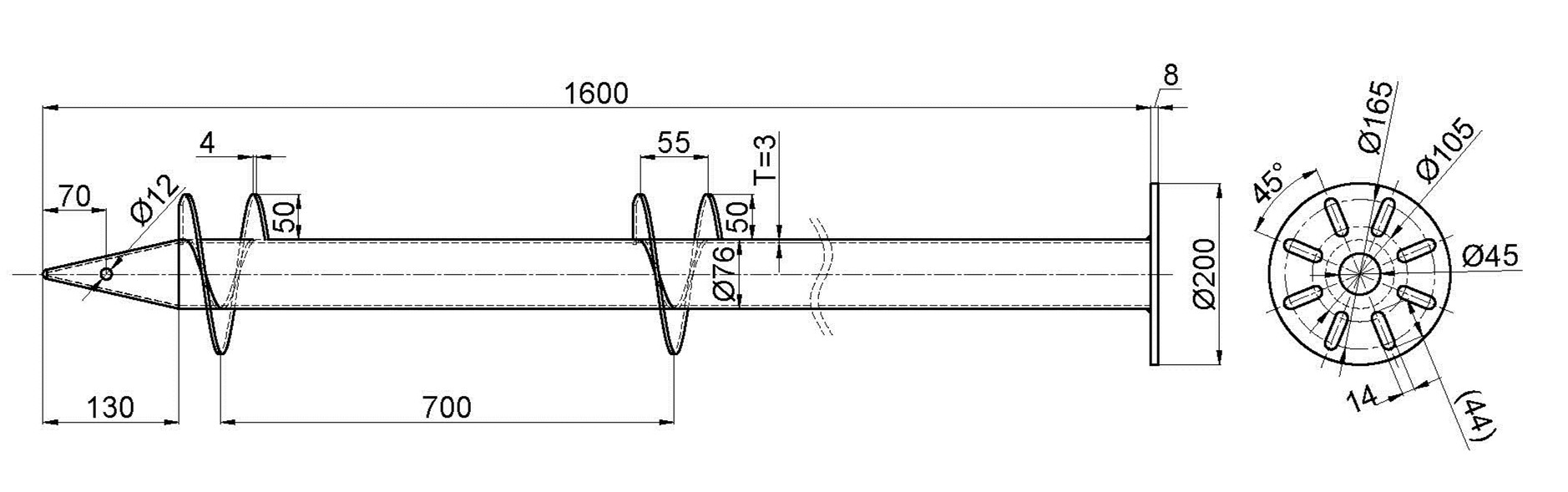 nombre del producto tornillo de tierra helicoidal Con brida material acero Q235B Anti - corrosivo Caliente - dip galvanizado (DIN en ISO1461) diámetro de la tubería 76 mm espesor de la tubería 3 mm (2,5 mm / 3,5 mm / 3,75 mm / 4 mm / 5 mm) diámetro de la brida 200 mm / 220 mm longitud de la tubería 1600 mm (según por clientes requisito) número de hoja 2 Cuchillas / 4 cuchillas color plata garantía 10 años de garantía