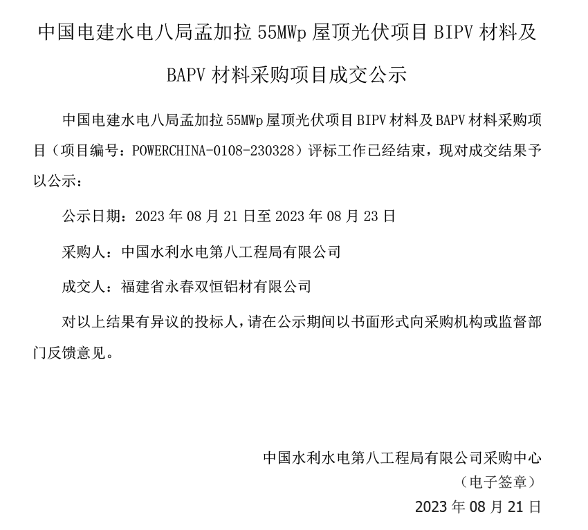Nos sentimos honrados de firmar un nuevo contrato de cooperación con Power China . El proyecto BIPV en tejado de 55 MW autorizó con éxito a Kinsend (Shuangheng Aluminium) como proveedor de sistemas de montaje solar en Bangladesh.