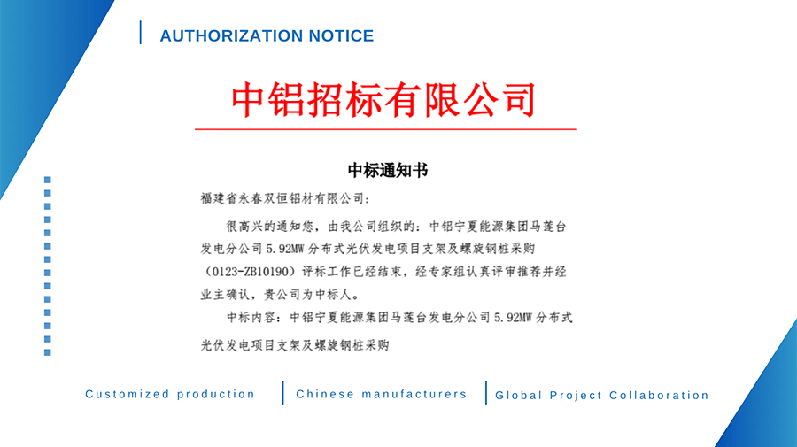 Es un gran honor recibir la carta de aviso de autorización de oferta de soportes de tierra solares y tornillos de tierra para el proyecto de generación de energía solar de 5,92 MW de la sucursal de generación de energía Maliantai de China Aluminium Ningxia Energy Group. Gracias a la confianza y el apoyo de China Aluminium Ningxia Energy.