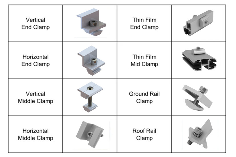 - Las abrazaderas solares pueden funcionar con la mayoría de los tipos de paneles solares y rieles.