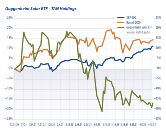 En abril de este año, Invesco ETF solar, que rastrea Mac índice solar global, realizado significativamente peor que s y P 500 y DOW Jones industrial Índice. El Guggenheim Solar ETF (Tan) Cayó un 8,7%, mientras que el S & P 500 y DOW Rose 3.4% y 2.7% respectivamente. En comparación con diciembre del año pasado, el Guggenheim Solar ETF (Tan) fue un 23,2%, mientras que el estándar & Pobre 500 índice y el DOW El índice de Jones se elevó solo el 2,6%.
