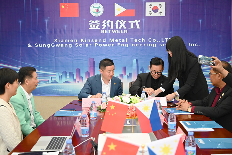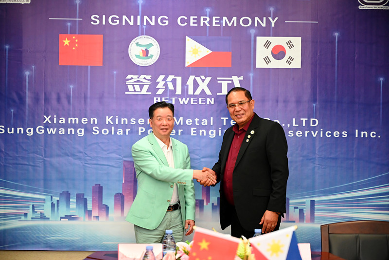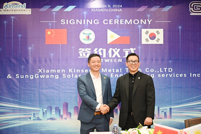 El 5 de marzo de 2024, se llevó a cabo con éxito la ceremonia de firma entre SungGwang Solar Power Engineering Services, Inc. y Xiamen Kinsend Metal Tech Co., LTD de la Zona Económica Especial de la ciudad de Zamboanga, Filipinas, proyecto de granja de energía solar (terrestre) de 20 MW (megavatios). en la fábrica del grupo Shuang Heng de Kinsend Company en Fujian, China.